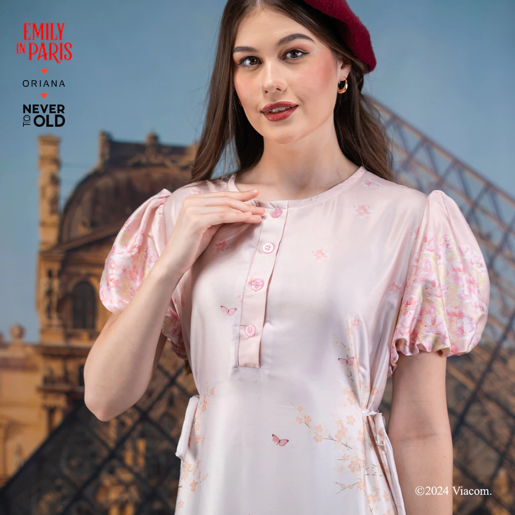 Berkolaborasi dengan Emily in Paris, Oriana menghadirkan dress rumahan yang cantik dengan motif khas Paris ala Emily.